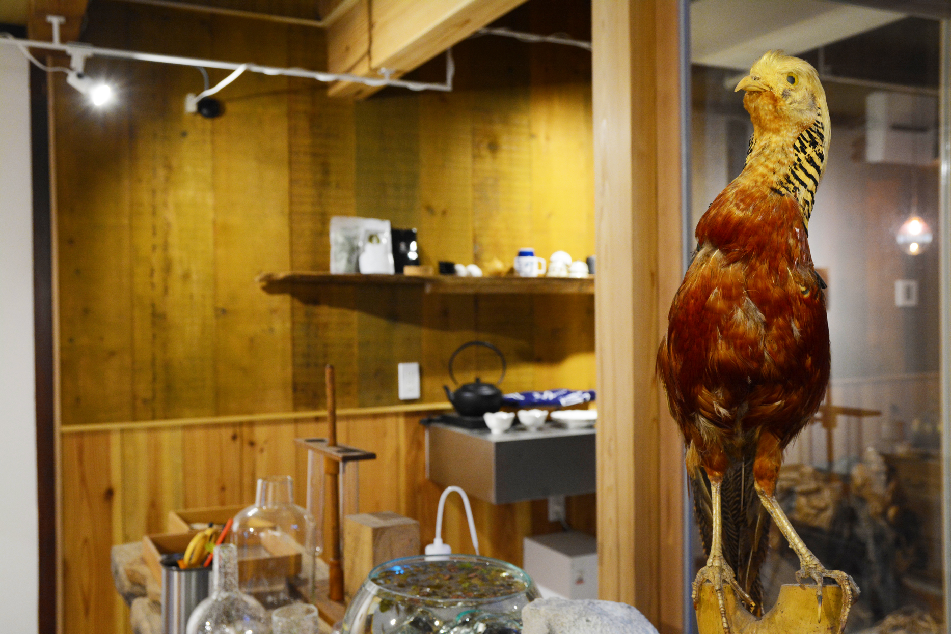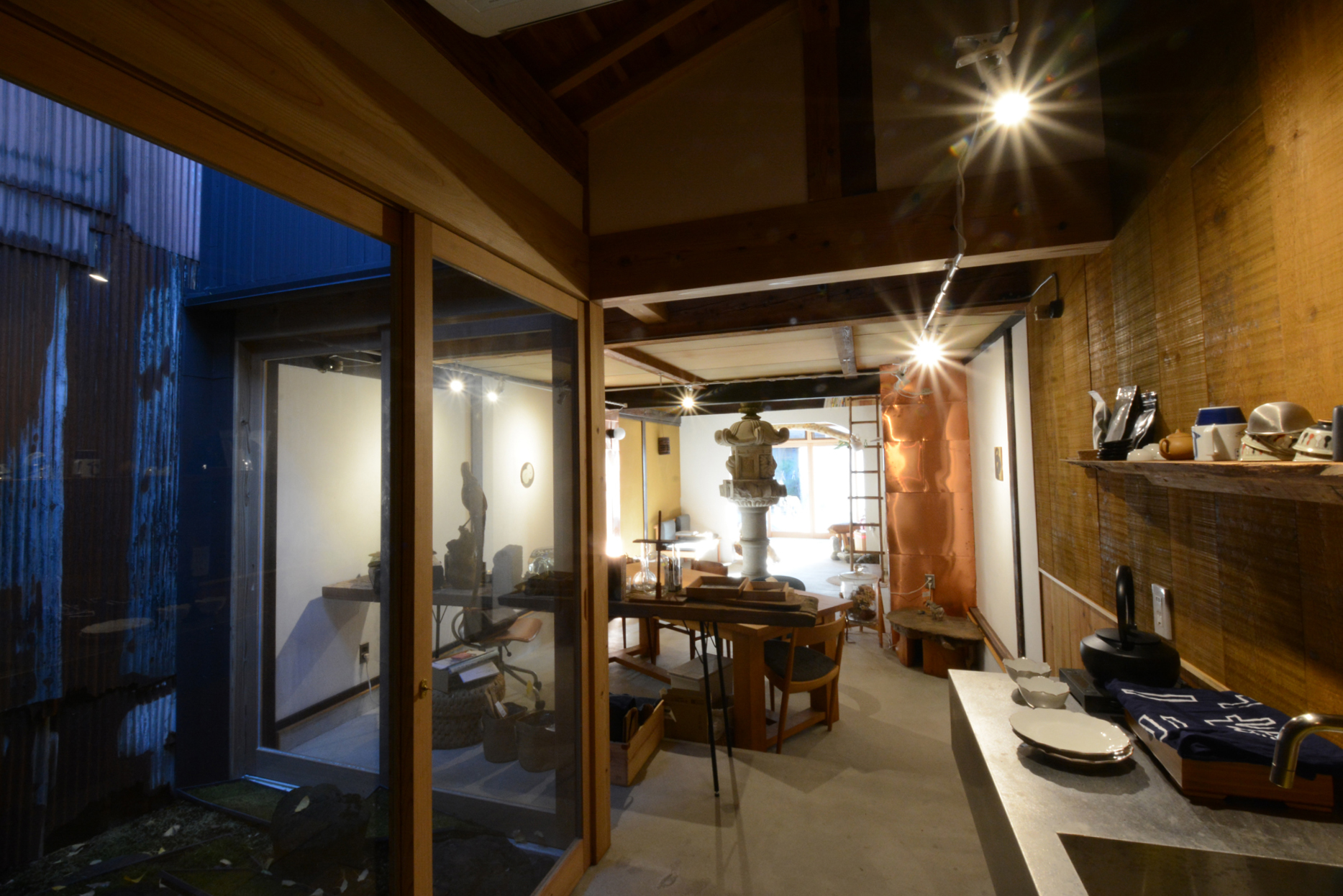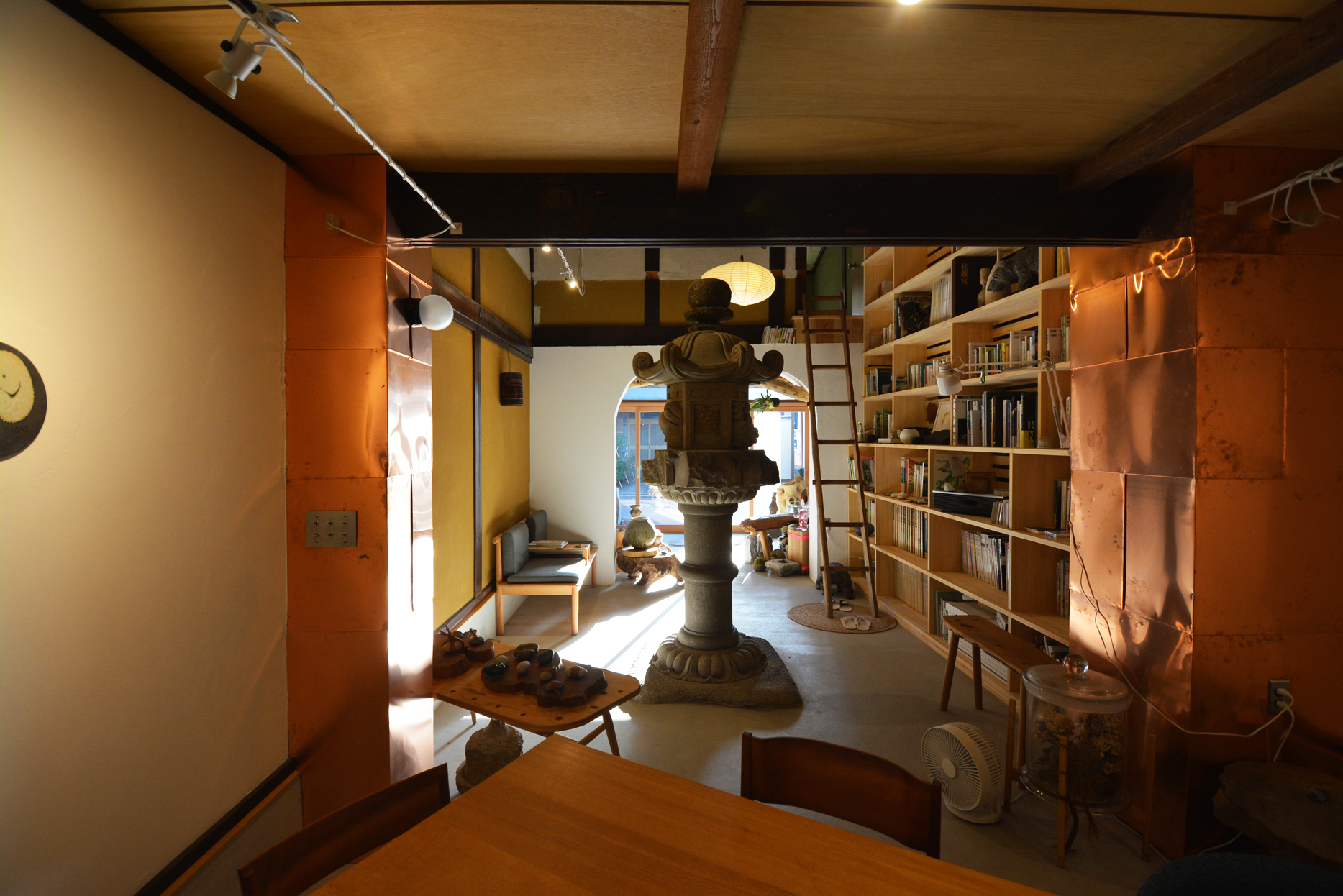 さらに奥から空間を眺めてみます。人間の背丈よりも高い6尺以上の灯籠。どれだけ空間を占領しているか、ご理解頂けると思います。左右に見える金ピカの角柱は銅板の一文字張り。今はピカピカですが、何年もかけて茶色になり、そのうち粉を吹いて緑色になります。経年美化を室内空間で楽しんで頂ければ幸いです。
