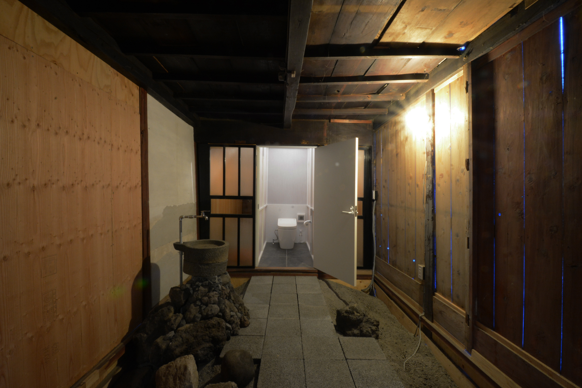 土蔵を抜けて、トイレへ。え、土蔵を抜けて??そうなのですが、山崎さんのオフィスは、土蔵を介して北側の建物、南側の建物がつながっており、土蔵には南北でそれぞれ出入り口があるのです。けっこう珍しいケースです。トイレの設置位置は悩みましたー。トイレのための空間をあらたに設えてしまうと予算オーバーとなります。そこで考えたのがこちら、既存の部屋に約1坪のトイレスペースの入れ込んでしまうアイデア。しかも、スチールの枠でビニールハウスのような発想でデザインしました。トイレに至る空間も山崎さんのDIYです。(どれだけ施主さんに仕事さすねん!!)