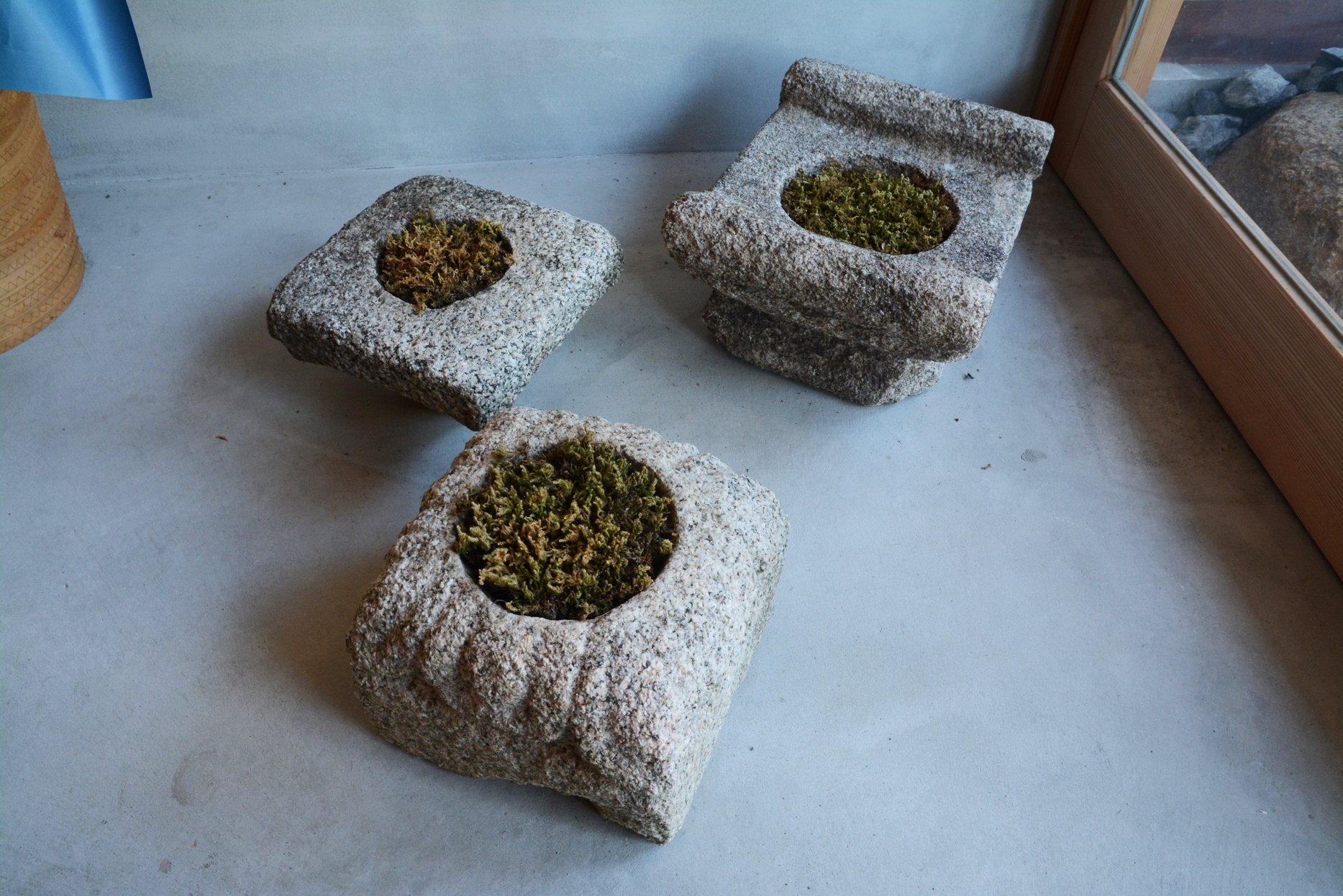 こちらの写真は、合成画像でもAI生成画像でもありません。間違いなく、お庭の石灯籠の背後に本棚がそびえっている実在の空間です。ここは、庭の設計と施工を行う山崎広介さんのオフィス兼ギャラリー。山崎さんの庭に対する思いやご自身の世界観をプレゼンテーションする場がついに完成しました。灯籠を室内に置くことを考えたのは私ではなく、山崎さん。その提案を聞いたときは「え、基礎はどうするの?」と思いましたが、コンクリートの床と一緒に埋めてしまうことで解決。しかし、デカい!!
