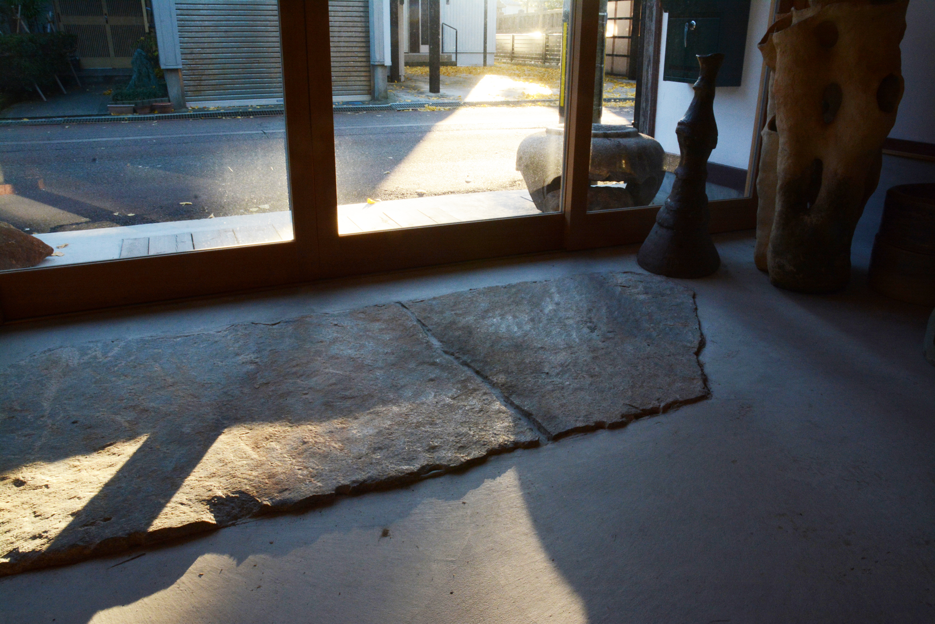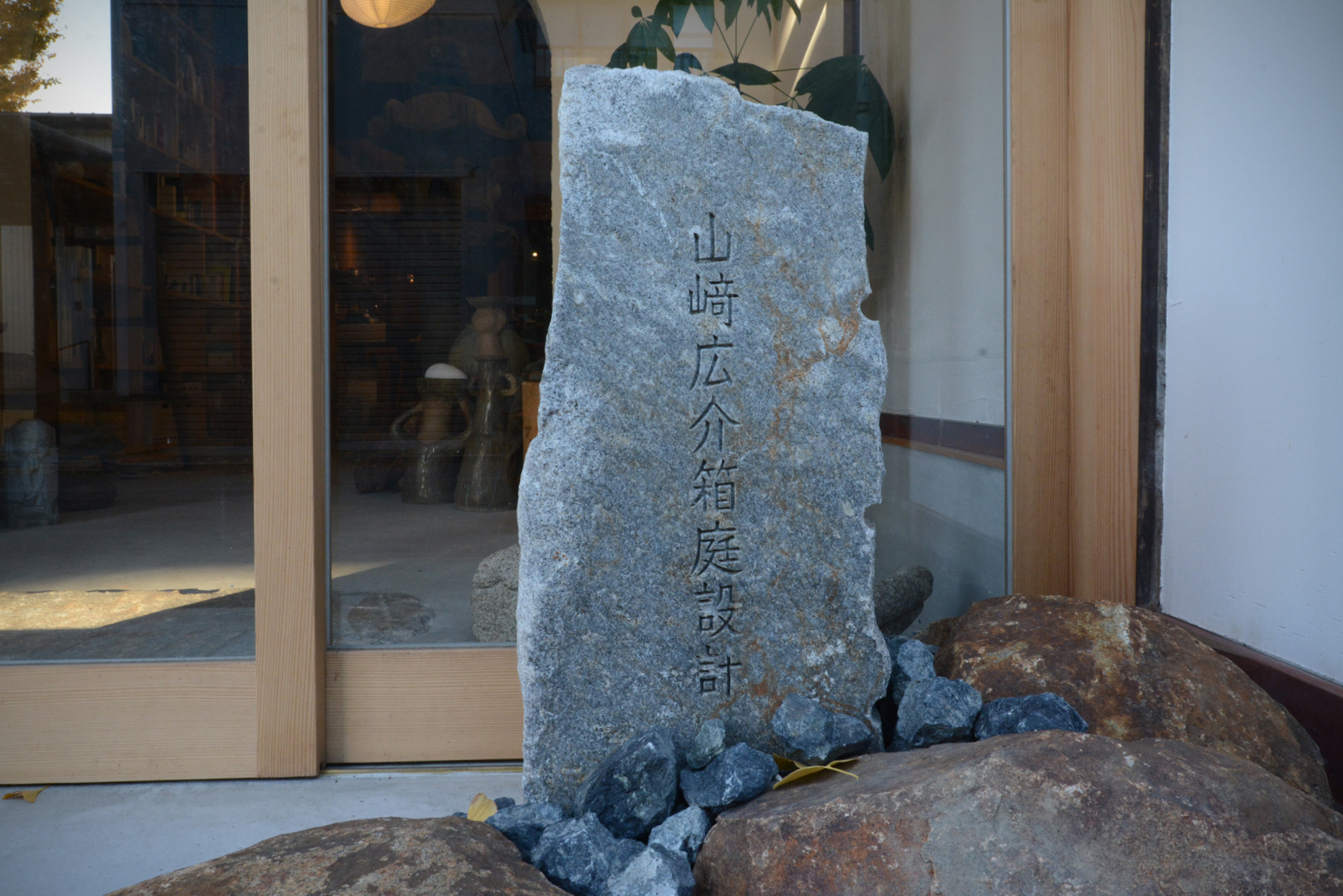 こちらがオフィスの看板です。ん、墓??と思った方、それはちょっと!!と言いたいところですが、ある意味正解です。というのも、この石柱は山崎さんの祖先の墓の石材の一部なんだそうです。こちらも山崎さんのアイデアで、私のなかの発想にはなかったものです。今回のようにクライアントがクリエーターというケースは、とても楽しい。私も大いに刺激をもらいながら、シナジーを生み出す体験はかけがえのないものです。