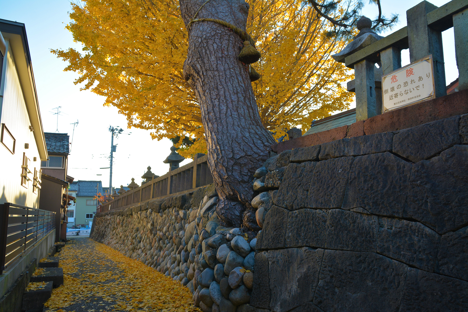 オフィスの斜向かいにある神社、氣比住吉社の脇にある路地。神社の敷地からニョキっと伸びる松と銀杏の木。落ち葉がきれいです。ん〜、贅沢すぎる。
